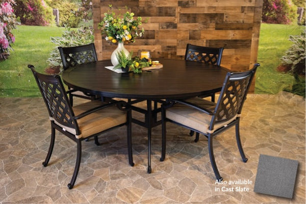 DWL Glenhaven Chateau Outdoor Dining 66 Round Stone Harbor Slat Table with 4 Chairs and Sunbrella Cushions in Cast Slate 40434