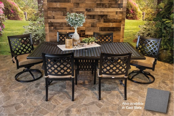 DWL Chateau Patio Dining 46x86 Weave Table with 4 Stationary and 2 Swivel Chairs with Sunbrella Cushions in Cast Slate