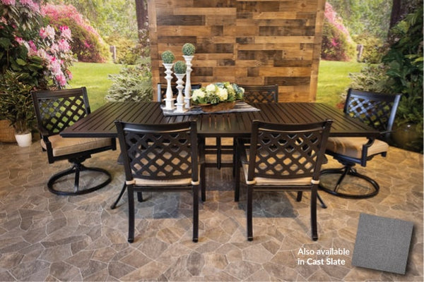 DWL Glenhaven Chateau Patio Dining 46x93 Stone Harbor Table and 4 Stationary and 2 Swivel Chairs with Sunbrella Cast Slate Cushions 40434