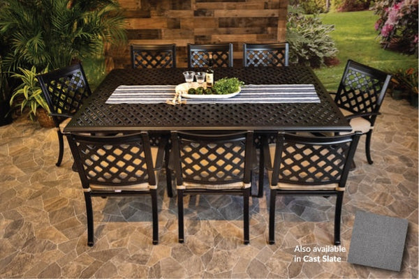 DWL Chateau Patio Dining 60x84 Weave Table with 8 Chairs and Sunbrella Cushions in Cast Slate 40434