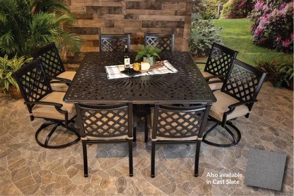 DWL Glenhaven Chateau Patio Dining 64 Square Table with 4 Stationary and 4 Swivel Chairs with Sunbrella Cushions in Cast Slate