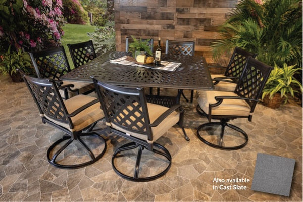 DWL Glenhaven Chateau Patio Dining 64 Square Table with 8 Swivel Dining Chairs and Sunbrella Cushion in Cast Slate