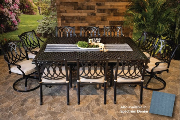 DWL Glenhaven Chelsea Outdoor Dining 60x84 Weave Table with 6 Stationary and 4 Swivel Chairs with Sunbrella Spectrum Denim