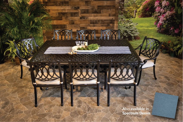 DWL Glenhaven Chelsea Outdoor Dining 60x84 Weave Table with 8 Chairs and Sunbrella Cushions in Spectrum Denim